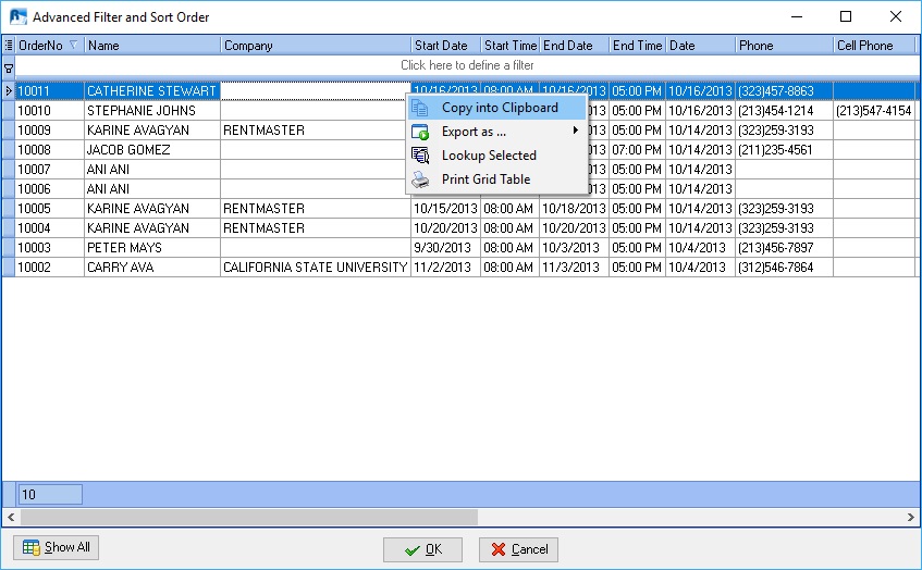 The filtering and sorting features give you an easy way to print the records you want sorted by any field. This is very useful when you for example, want to schedule the orders' delivery/pickup. You can filter the orders to have only the orders for a specific date/time, orders by zip code and as a result you'll have all the orders within a specific area printed together which is useful when you're making a decision about orders' delivery/pickup.