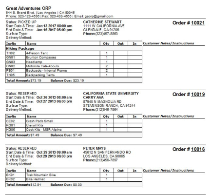 Orders list contains information about the order no, starting/ending date/time, customer name and address, and the list of reserved items, providing you with all the necessary information to make decisions about orders' delivery/pickup.