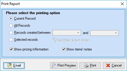For reports you can select a single record, a group of records created between specified dates, all records, or select records by applying your custom filters and sort order.
