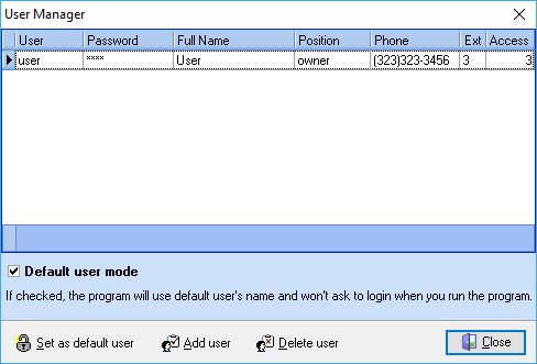 You can easily add new users by using the User Manager. When you mark a user account as 'default,' and RentMaster is in 'Default User Mode,' the software won't show the login window and will use the default user information. When the user makes a new quote or a new order, or confirms an order, RentMaster stores the user's name with the order/quote and when it's running in Default User Mode, it'll use the default user information for these purposes.